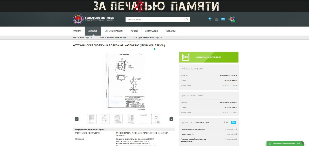 Электронные торги стартовали 15 августа 2023 г. в 9.00 и продолжались более 37 часов. С электронных торгов продавалась артезианская скважина вблизи аг.Хатежино (Минский район). В торгах принимало участие 6 участников. В ходе торгов совершено 166 ставок. Стоимость имущества возросла в 5,5 раз и составила 14,5 тыс. рублей.