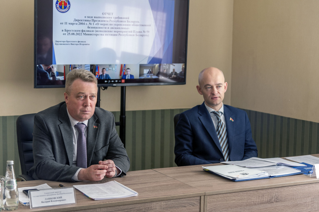 Заместитель Министра юстиции Костюкевич Дмитрий Олегович обратил особое внимание на безусловность выполнения предприятием возложенных на него задач и функций в строгом соответствии с требованиями законодательства, в том числе Директивы Президента Республики Беларусь от 11 марта 2004 г. № 1 «О мерах по укреплению общественной безопасности и дисциплины».