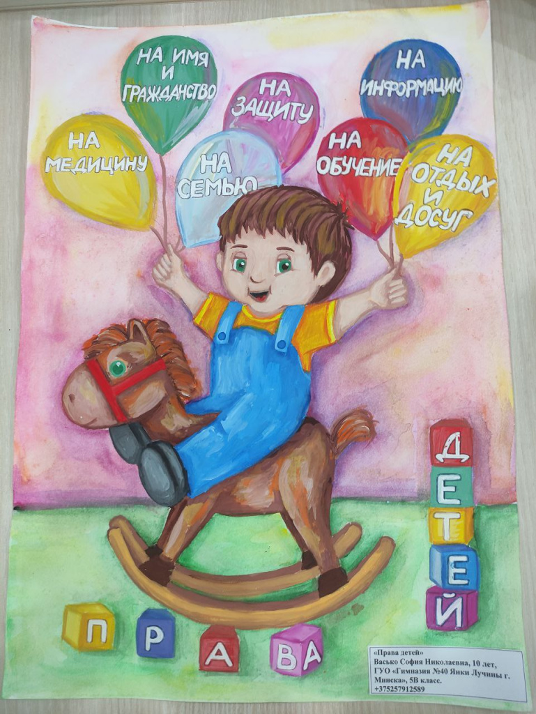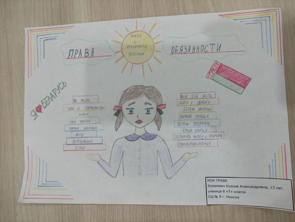 В числе участников конкурса – дети работников государственного предприятия «БелЮрОбеспечение», которые с энтузиазмом подготовили работы по следующим тематикам: права ребенка; социальная защита семьи и детей государством; защита прав детей-сирот и детей, оставшихся без попечения родителей; права детей-инвалидов; обязанности ребенка.