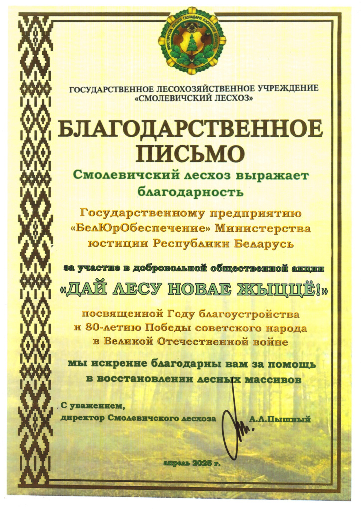 Сегодня работники государственного предприятия «БелЮрОбеспечение» присоединились к республиканской добровольной акции «Дай лесу новае жыццё!», участие в которой направлено на восполнение лесных культур в Волмянском лесничестве.
