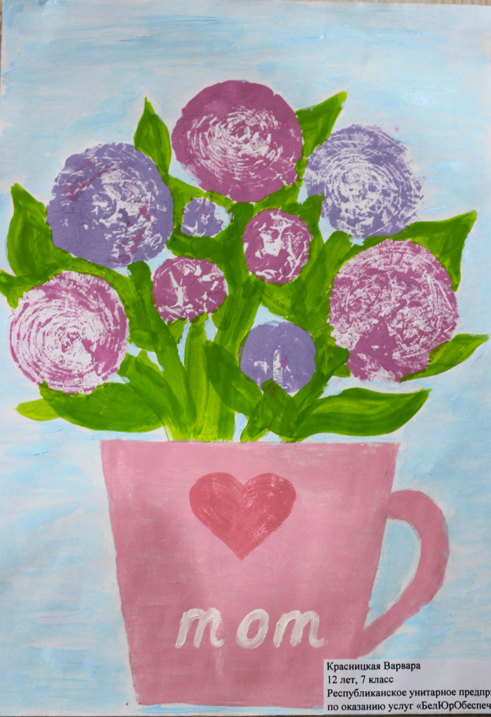 В числе участников конкурса — дети работников государственного предприятия «БелЮрОбеспечение», которые с энтузиазмом подготовили работы по номинации «Букет для мамы». На конкурс принимаются рисунки с изображением букетов, любимых маминых цветов, цветочных композиций. Это не просто творческое задание — это искреннее признание в любви, уважении и благодарности.