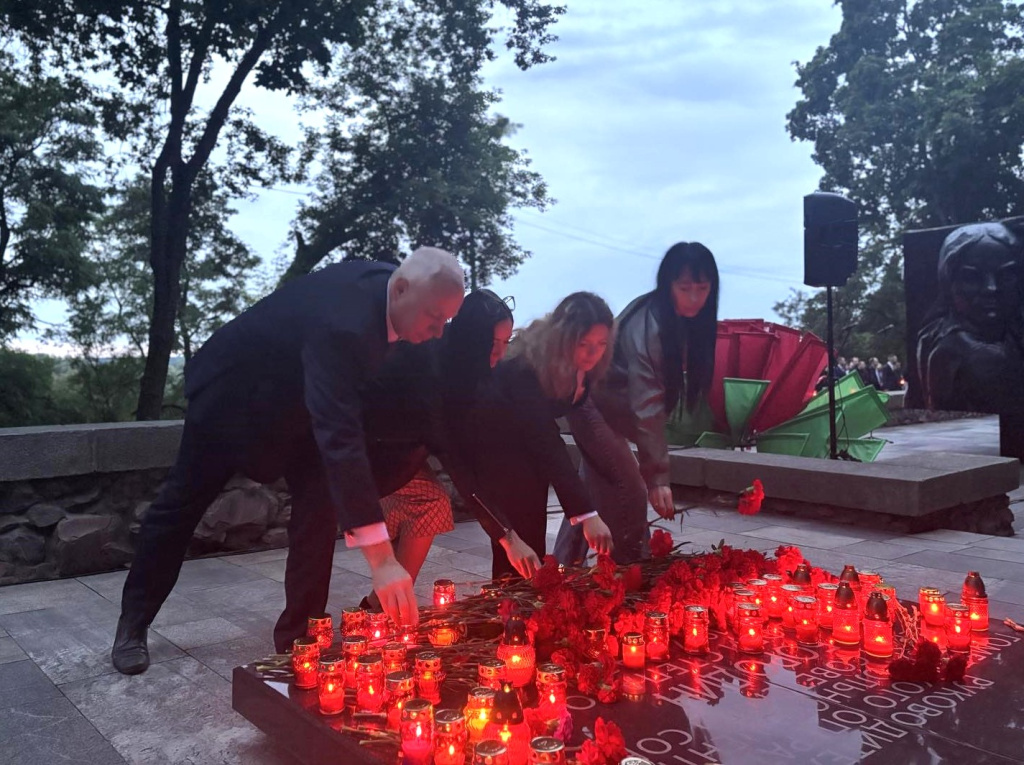 Работники Гомельского филиала государственного предприятия «БелЮрОбеспечение» приняли участие в митинге, который проходил с зажжением лампад и возложением цветов в честь Дня всенародной памяти жертв Великой Отечественной войны и геноцида белорусского народа у мемориала героям-ополченцам на рассвете 22 июня 2025 года.