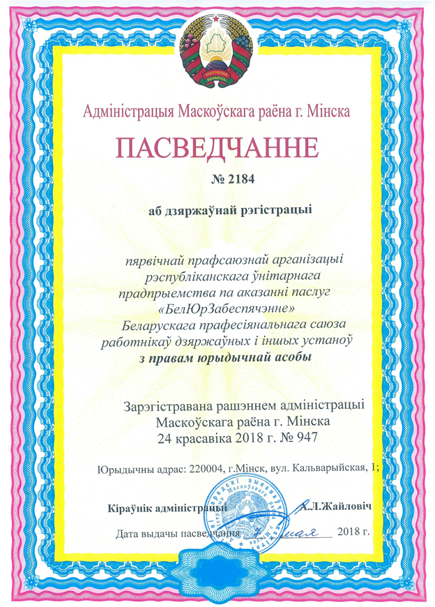 24 апреля 2018 года решением администрации Московского района г. Минска зарегистрирована первичная профсоюзная организация республиканского унитарного предприятия по оказанию услуг «БелЮрОбеспечение» Белорусского профессионального союза работников государственных и других учреждений, наделенная правами юридического лица. Выдача «Свидетельства о государственной регистрации» профсоюзной организации состоялась 7 мая 2018 года.