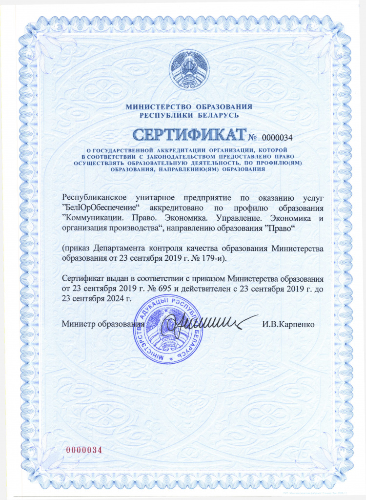 Полномочия Предприятия по реализации образовательных программ повышения квалификации подтверждено также договором с Министерством юстиции Республики Беларусь.