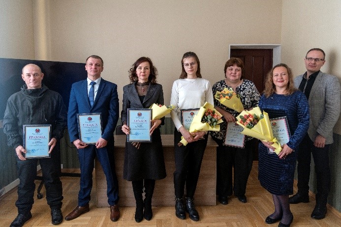 Генеральный директор предприятия в торжественной обстановке вручил отличившимся работникам грамоты государственного предприятия «БелЮрОбеспечение» начальнику отдела по продаже имущества Побылой И.А., старшему охраннику Шарыхину А.А., охраннику Сарамахе Э.Ф., а также объявил благодарности ведущему оценщику Ткаченку Е.А., ведущему юрисконсульту по реализации Шершень А.А., ведущему бухгалтеру Тарасюк Е.И., ведущему юрисконсульту Старых Г.Н., ведущему специалисту по строительству Мороз Н.В.