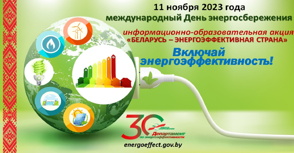 С 8 по 11 ноября 2023 года под девизом «Включай энергоэффективность!» в республике проходит информационно-образовательная акция «Беларусь – энергоэффективная страна», приуроченная к международному Дню энергосбережения, который ежегодно отмечается 11 ноября.