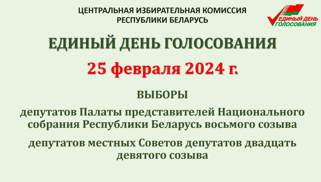 «Нынешняя избирательная кампания станет самой масштабной в истории суверенной Беларуси. 25 февраля 2024 года белорусы будут выбирать депутатов всех уровней - в Палату представителей Национального собрания Республики Беларуси 8-го созыва и в местные Советы 29-го созыва, а 4 апреля определится состав Совета Республики. Еще одна особенность - это формирование состава Всебелорусского народного собрания - органа, который по итогам референдума обрел в Беларуси конституционный статус» - отметила Елена Анатольевна.