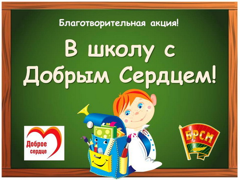 1 августа стартовала республиканская благотворительная акция «В школу с добрым сердцем», организатором которой с 2015 года выступает общественное объединение «Белорусский республиканский союз молодежи». Целью данной акции является привлечение внимания общественности к оказанию адресной социальной помощи нуждающимся семьям. Перед началом учебного года по всей стране организованы пункты сбора канцелярских и спортивных принадлежностей, учебных пособий, школьной одежды, обуви и других необходимых вещей в торговых центрах, магазинах, общественных местах с большой проходимостью, территориальных комитетах союза молодежи.