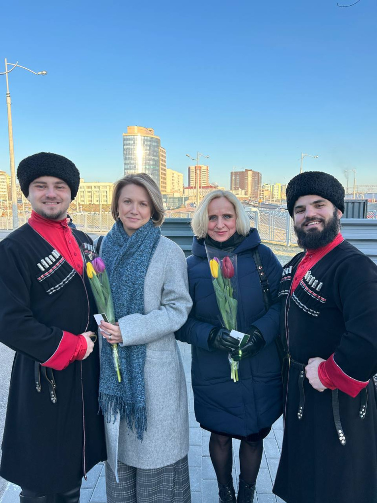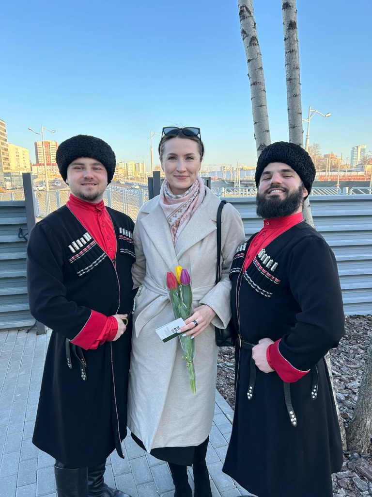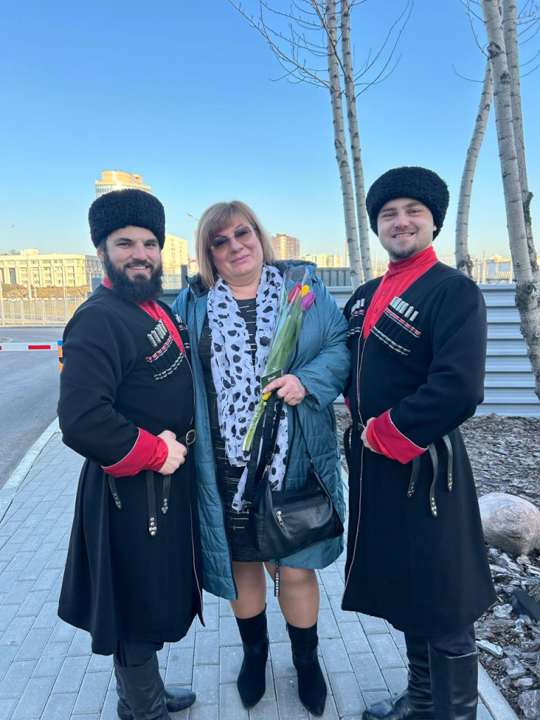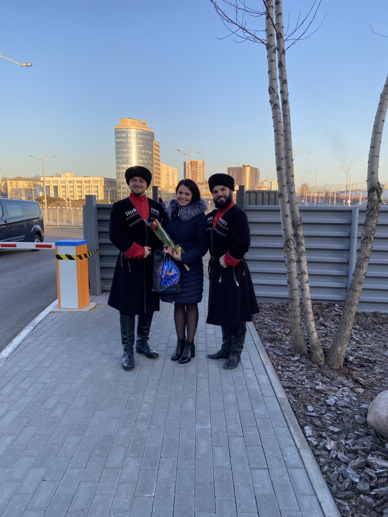 Утро предпраздничного дня началось для всех женщин предприятия с улыбок, цветов, поздравлений и встречи с казаками ансамбля «Маме нравится».