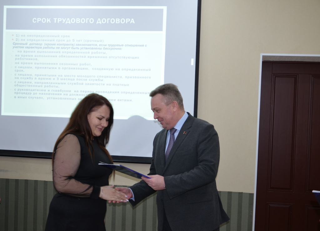 Представители 11 предприятий и организаций успешно прошли итоговую аттестацию и получили документ об образовании. Свидетельства о повышении квалификации вручил генеральный директор государственного предприятия «БелЮрОбеспечение» Валерий Дашковский