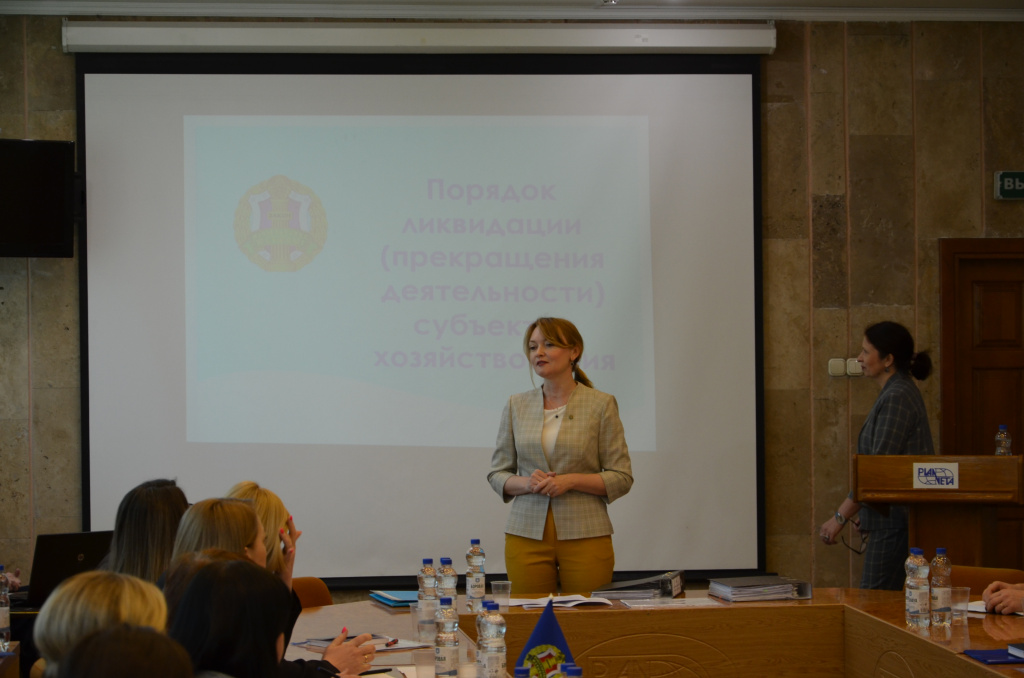 Спикерами на мероприятии выступили начальник управления единого государственного регистра юридических лиц и индивидуальных предпринимателей Министерства юстиции Республики Беларусь Инна Леус, заместитель начальника управления Марина Кисель, а также консультанты управления. Они ознакомили коллег с тонкостями ведения единого государственного регистра юридических лиц и индивидуальных предпринимателей, этапами развития в сфере создания и ликвидации бизнеса, рассказали о новациях, которые предусматривает проект Закона Республики Беларусь «О государственной регистрации и ликвидации (прекращении деятельности) субъектов хозяйствования».