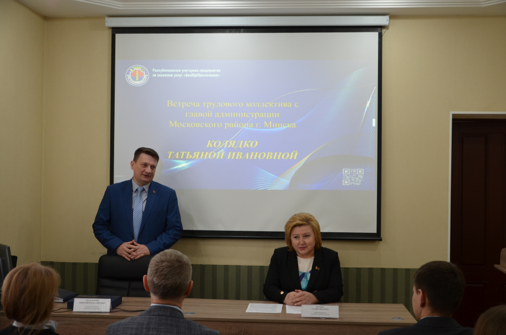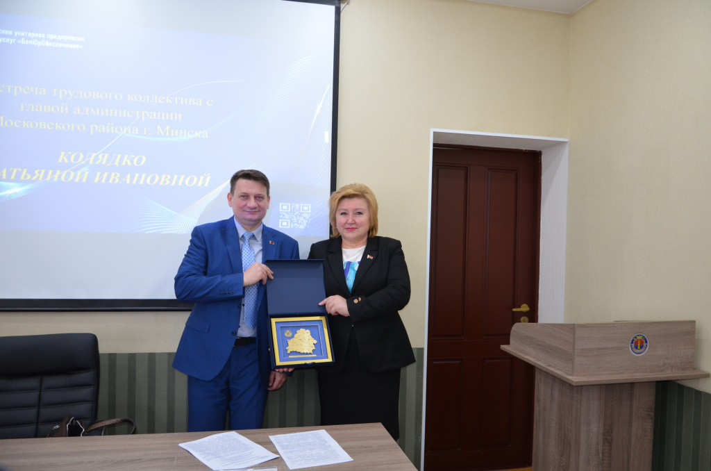 В рамках единого дня информирования состоялась встреча работников центрального аппарата государственного предприятия «БелЮрОбеспечение» с главой администрации Московского района г. Минска Татьяной Ивановной Колядко на тему «Республика Беларусь: проекты будущего».