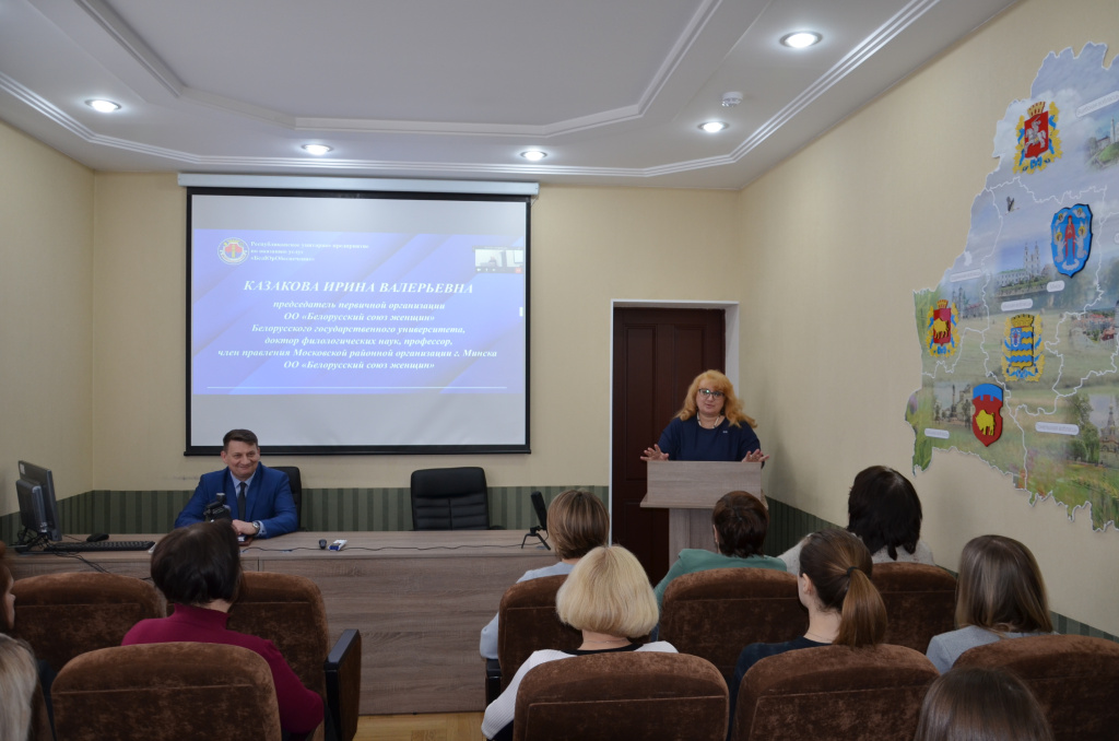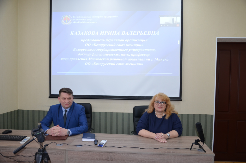 Сегодня на государственном предприятии «БелЮрОбеспечение» состоялась встреча с председателем первичной организации ОО «Белорусский союз женщин» Белорусского государственного университета, доктором филологических наук, профессором, членом правления Московской районной организации г. Минска ОО «Белорусский союз женщин» Ириной Казаковой.