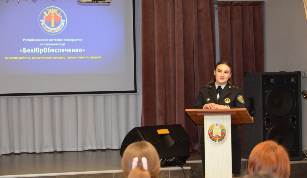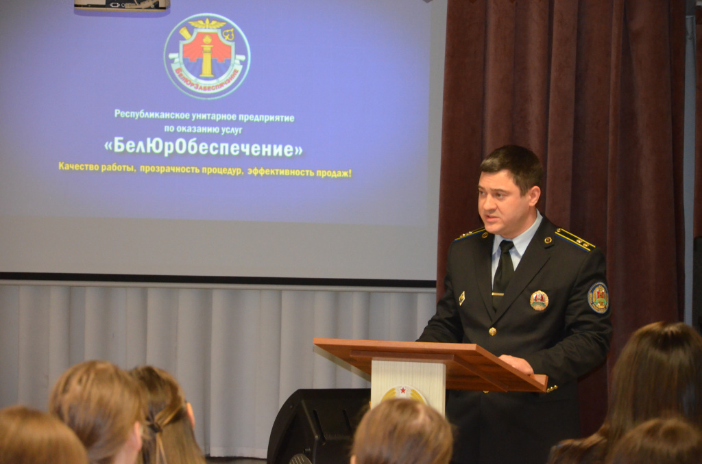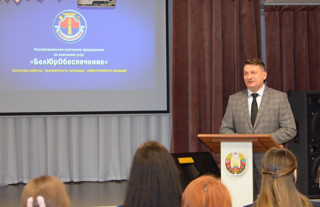 В рамках профориентационной встречи и привлечения молодых кадров для работы как на предприятии, так и в системе органов принудительного исполнеия продемонстрирован фильм о деятельности государственного предприятия «БелЮрОбеспечение» в целях ознакомления с основными принципами работы.