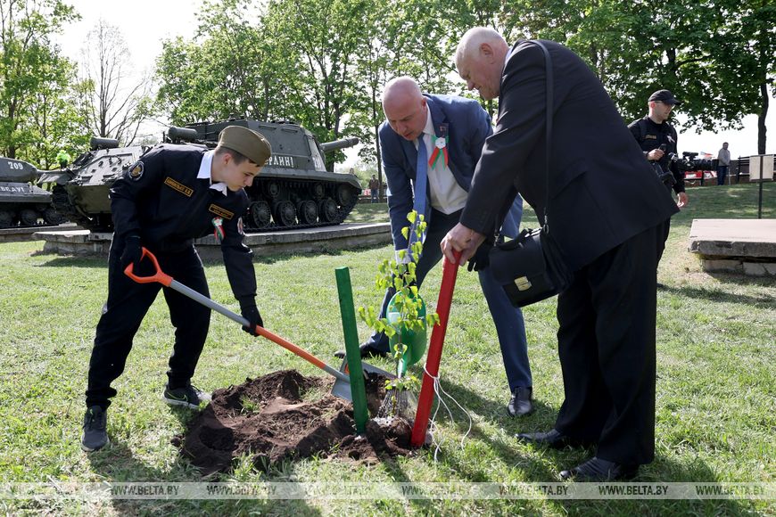 У Кургана Славы в Гродно развернулись стилизованные военные локации — привал, полевая почта, рейхстаг. Колонну встретили сотрудники органов внутренних дел и военнослужащие внутренних войск региона, воспитанники военно-патриотических клубов, а также жители и гости города.