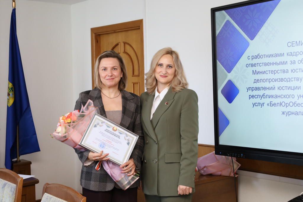 В рамках семинара ряд работников отмечен наградами. Так, Благодарность Министерства юстиции Республики Беларусь за образцовое выполнение служебных обязанностей и инициативность в работе, личный вклад в укрепление кадрового потенциала в сфере юстиции вручена Екатерине Владимировне Поповой, начальнику управления кадровой и учебно-методической работы республиканского унитарного предприятия по оказанию услуг «БелЮрОбеспечение».
