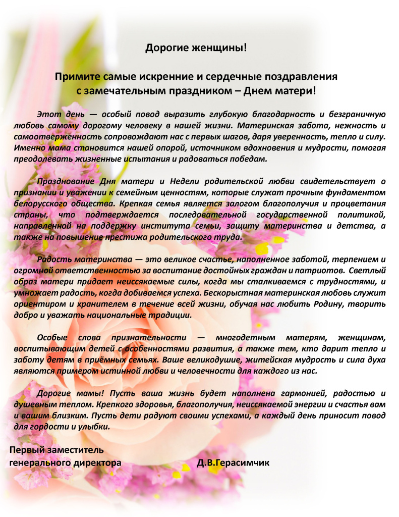 ПОЗДРАВЛЕНИЕ С ДНЕМ МАТЕРИ ПЕРВОГО ЗАМЕСТИТЕЛЯ ГЕНЕРАЛЬНОГО ДИРЕКТОРА ГОСУДАРСТВЕННОГО ПРЕДПРИЯТИЯ «БЕЛЮРОБЕСПЕЧЕНИЕ»
