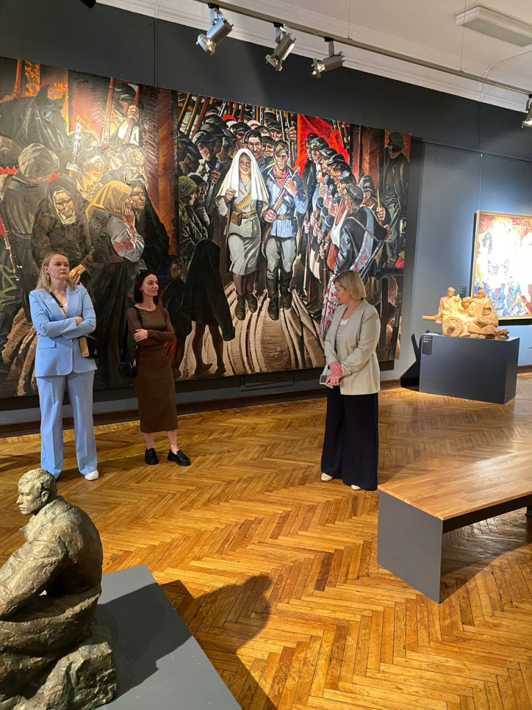 Вначале они побывали на выставке «Художник на войне. Художник о войне. Художник после войны» в Национальном художественном музее Республики Беларусь. Экспозиция, включающая живопись, графику, скульптуру и декоративно-прикладное искусство белорусских художников XX-XXI веков, представляет собой изобразительную летопись военного и послевоенного времени. В ней представлены работы художников — очевидцев, участников войны и детей военного времени, отражающие их взгляд на события Великой Отечественной войны и Победы. Посетители увидели редкие зарисовки 1941–1945 годов, портреты и автопортреты художников-фронтовиков, а также произведения, посвящённые послевоенной жизни и восстановлению страны.