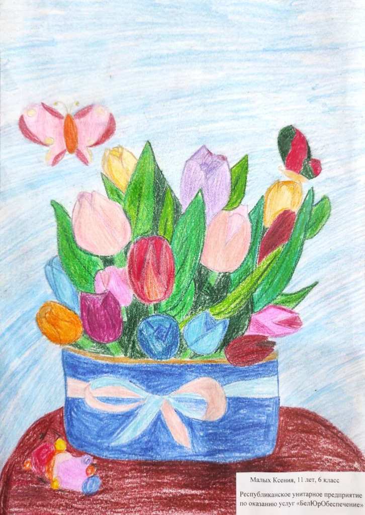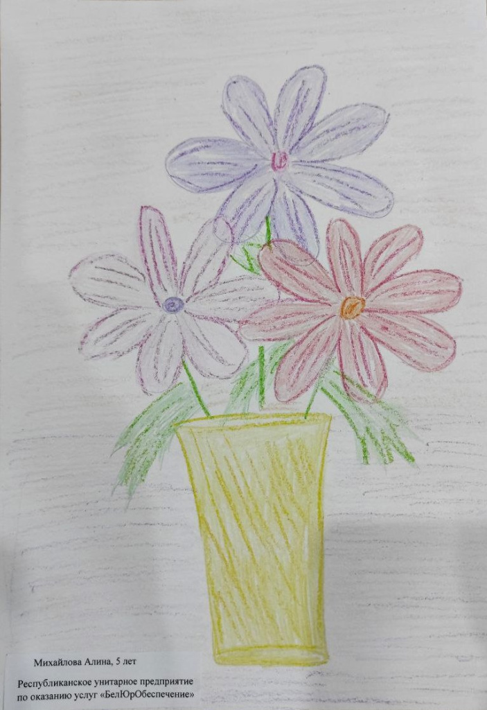 В числе участников конкурса — дети работников государственного предприятия «БелЮрОбеспечение», которые с энтузиазмом подготовили работы по номинации «Букет для мамы». На конкурс принимаются рисунки с изображением букетов, любимых маминых цветов, цветочных композиций. Это не просто творческое задание — это искреннее признание в любви, уважении и благодарности.